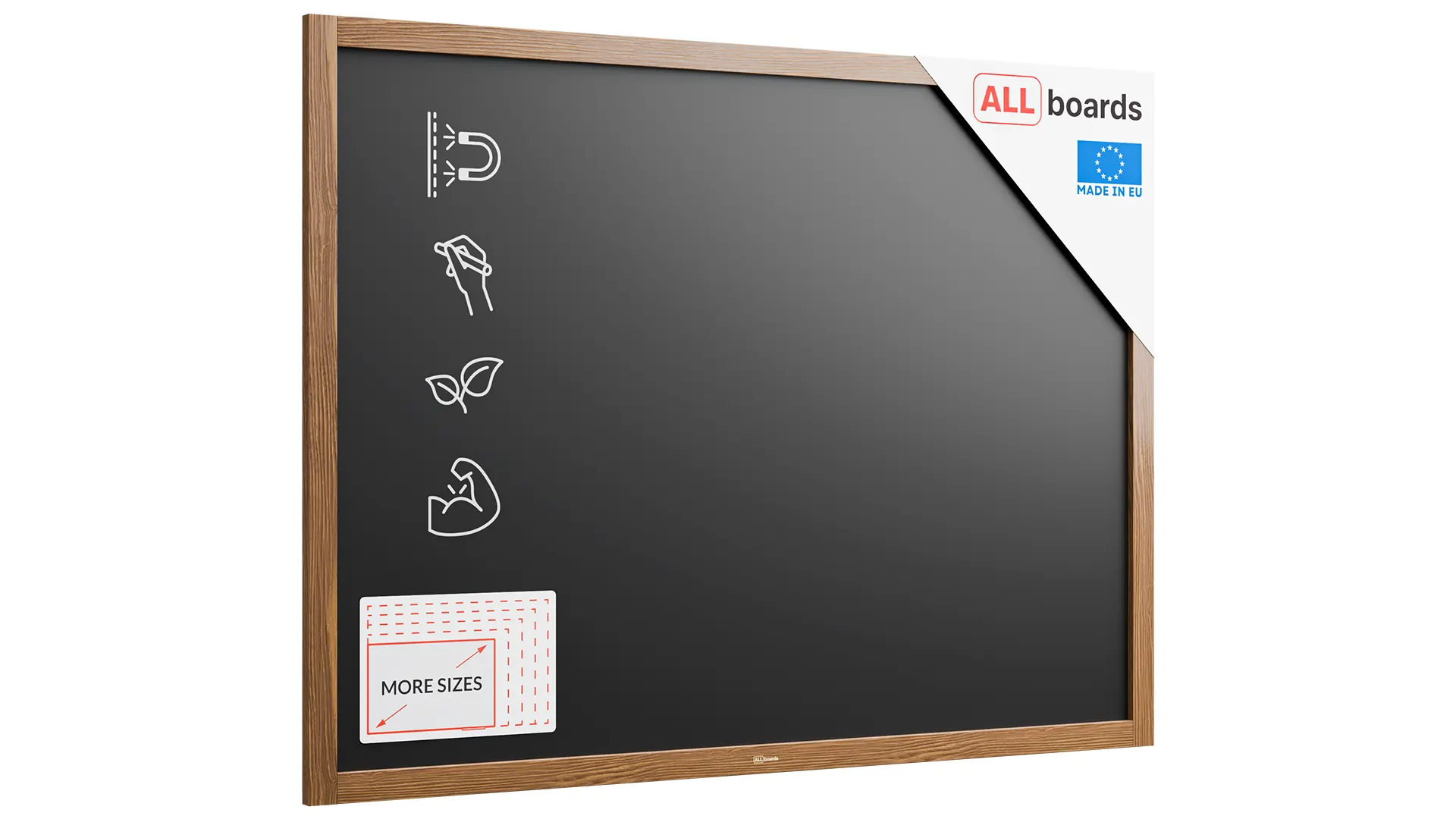 La superficie della lavagna da gesso è realizzata con un pannello laccato di colore nero in fibra di legno HDF, caratterizzato da un’alta densità di materiale. L’accurato processo di copertura della superficie con una lacca speciale garantisce il corretto contrasto e fa sì che la polvere dei gessetti o dei pennarelli a gesso non penetri nella superficie e che sia facilmente cancellabile con un panno umido.